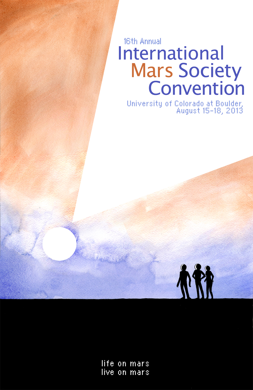 Seeing the one that they chose last year, I decided to make this year's a little more graphic. The theme of this years conference is "Finding Life on Mars & Bringing Life to Mars." Inspired by Curiosity photos of Martian sunsets, and the sense of vast open spaces that those photos create, I began my thinking in very large shapes. I considered how small the human form would look in such a huge space, and came up with a few sketches.
